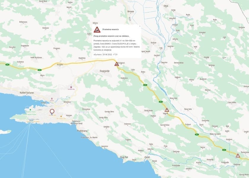 "Prometna nesreća na autocesti A1 Zagreb-Split-Ploče između čvora BISKO i čvora DUGOPOLJE (na 384. km) u smjeru Zagreba. Vozi se uz ograničenje brzine 40 km/h. Molimo korisnike za strpljenje.