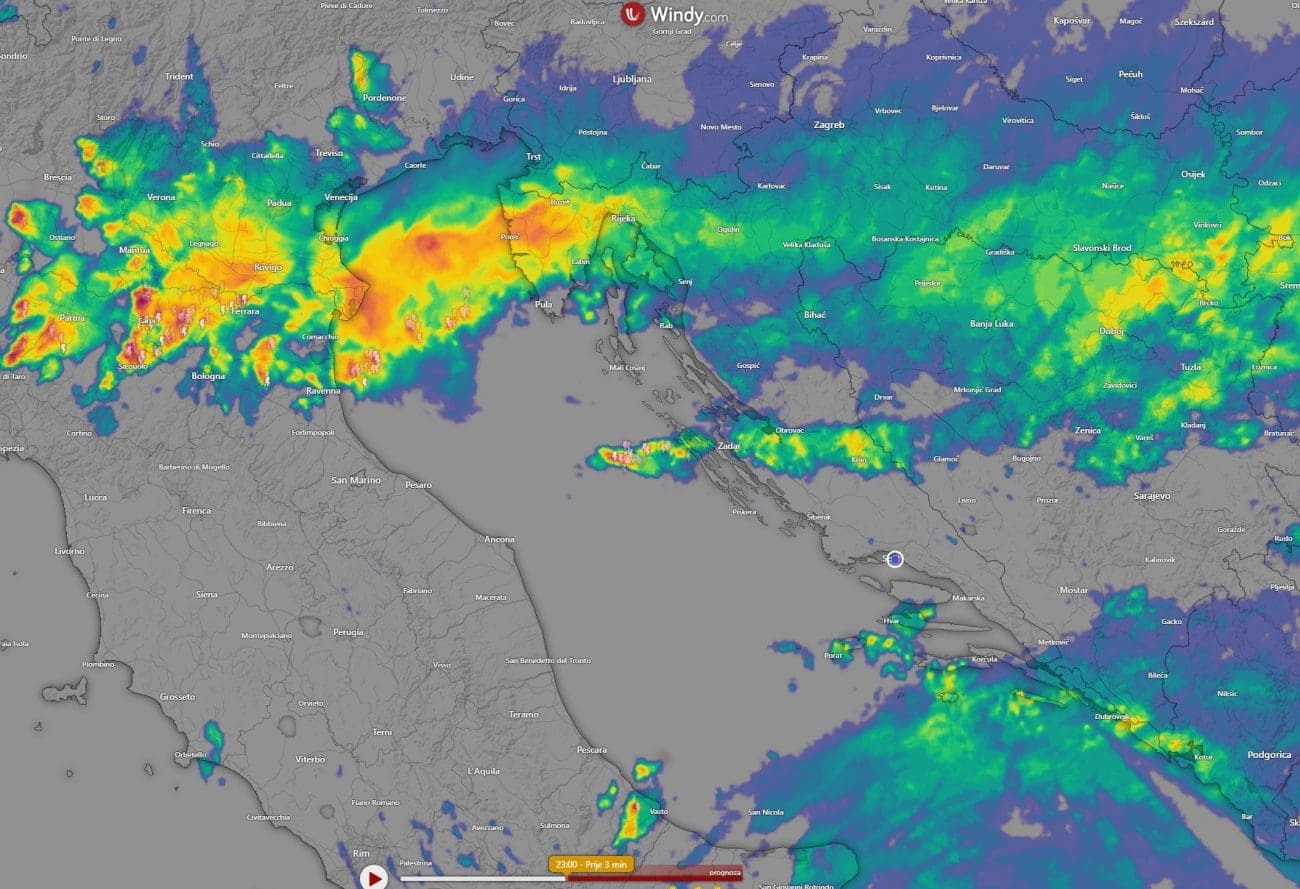 U kasnim večernjim satima kiše, pljuskova i grmljavine bilo je u Istri i na Kvarneru, a grmljavine je bilo i na zadarskom arhipelagu. Podno Velebita je zapuhala jaka do olujna bura.