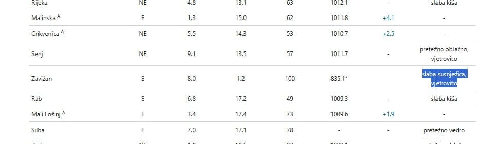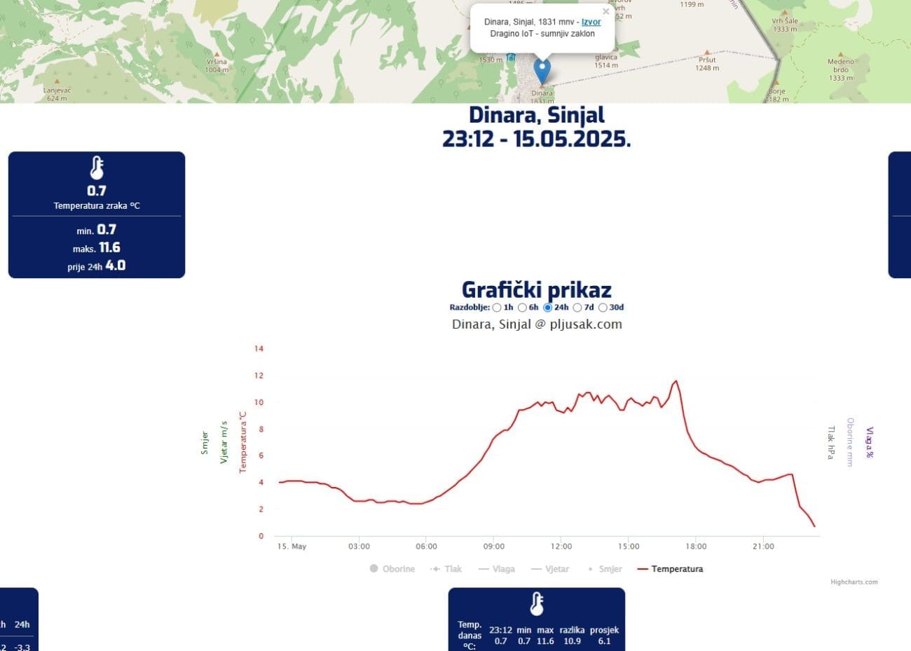 Visočica i Zavižan su najhladniji u državi s +1°C, a prema službenim podacima DHMZ-a na Zavižanu je u 22 sata padala susnježica što znači da će u najvišim dijelovima Velebita pada snijeg. Sinjal, najviši vrh hrvatskog dijela Dinare mjeri +0,7°C što znači da je i tamo okrenulo na snijeg.