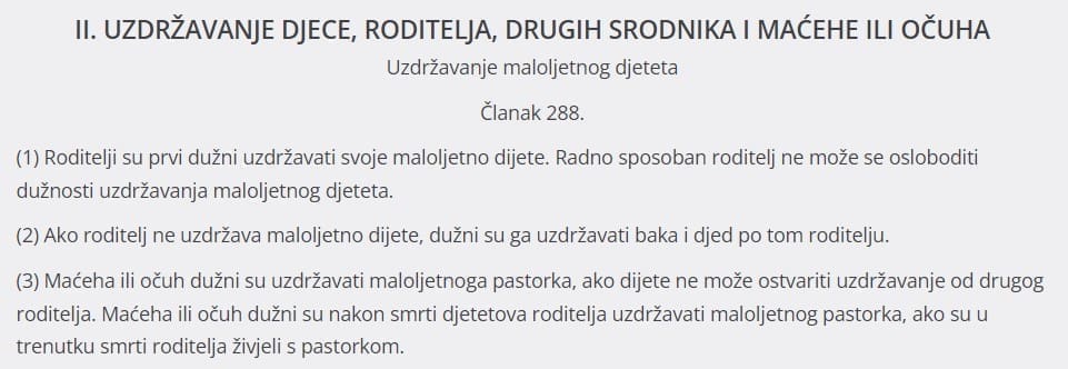 U članku 288., pod stavkom 2. Obiteljskog zakona iz 2014. godine propisano je "ako roditelj ne uzdržava maloljetno dijete, dužni su ga uzdržavati baka i djed po tom roditelju".