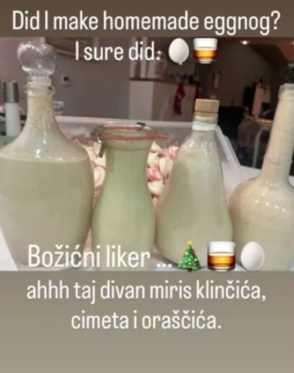 No, slatki zalogaji nisu bili jedini blagdanski adut. Sandra je pokazala i domaći liker od jaja, poznatiji kao eggnog, tradicionalno piće koje se u vrijeme Božića često priprema u Sjedinjenim Američkim Državama i Kanadi. Uz fotografiju likera duhovito je poručila: „Jesam li napravila domaći liker od jaja? Naravno da jesam“, dodavši kako se cijeli dom ispunio mirisima klinčića, cimeta i orašastih plodova.