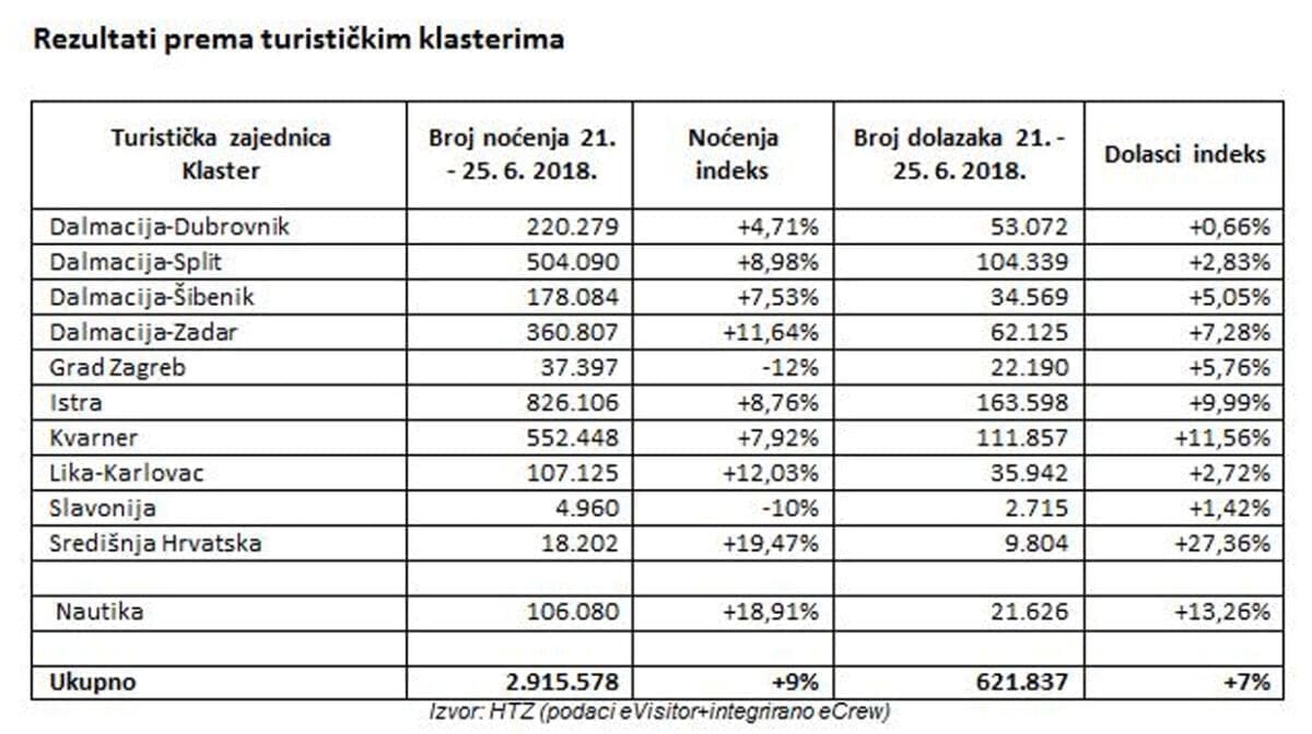 Prema podacima sustava eVisitor, koji evidentira promet prijavljenih turista u komercijalnim i nekomercijalnim smještajnim kapacitetima te kapacitetima nautičkog chartera (koji se prikupljaju putem sustava eCrew) na području Hrvatske je tijekom „produženog vikenda“ u razdoblju od 21. do 25. lipnja 2018. zabilježeno 2,9 milijuna turističkih noćenja i 621.000 turističkih dolazaka. U usporedbi s istim prošlogodišnjim „produženim vikendom“ riječ je o 9 posto više noćenja te 7 posto više dolazaka. Od ukupnog broja ostvarenih noćenja strani turisti su ostvarili 2,5 milijuna noćenja (+8%) i 550.000 dolazaka (+5%), a porast bilježe i domaći turisti koji su u noćenjima ostvarili rast od 17% te u dolascima od visokih 31%. Gledajući ukupno ostvarena noćenja po vrstama smještaja, najviše je noćenja ostvareno u objektima u domaćinstvu (1 milijun noćenja), hotelima (665.000 noćenja) i kampovima (589.000 noćenja).