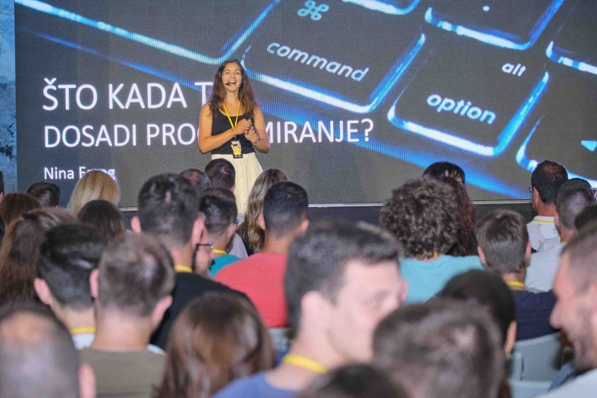 Na pozornicu se prva popela Nina Erceg product owner iz tvrtke Rimac Technology koja je pričala o tome "Što kada ti dosadi programiranje".