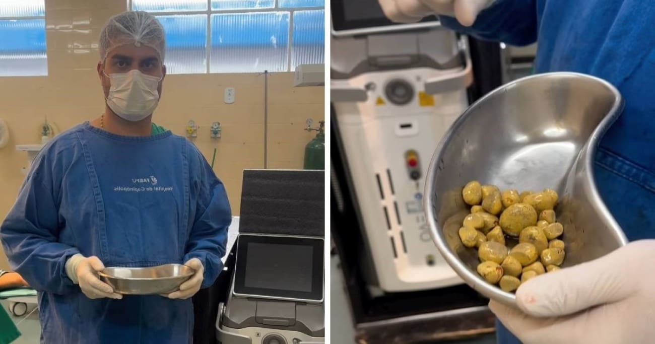 Govoreći na portugalskom, dr. Andrade je pokazao zdjelu punu velikih žutih kamenaca koje je izvadio tijekom zahvata, dok je pacijent još bio na operacijskom stolu.