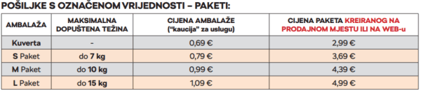 Primjerice, kuverta košta 66 centi, a njeno slanje 2,12 eura ako je pošiljka kreirana na internetu, odnosno 2,26 eura ako je to učinjeno na kiosku. Od 5. prosinca, kuverta će koštati 69 centi, a njeno slanje 2,99 eura, bez obzira je li to učinjeno na internetu ili na kiosku.