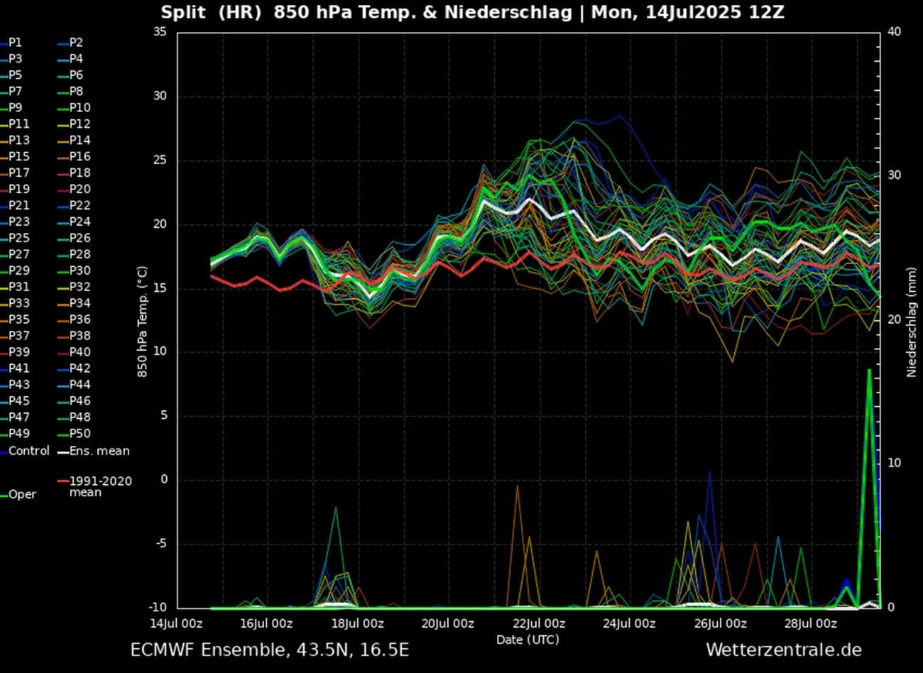 U ostatku novog tjedna vrlo teško ćemo svjedočiti scenarijima od prošlog utorka. Najveći broj dana bit će sunčan i suh uz vrućinu koja će tek malo popustiti u drugom dijelu tjedna. Naime, visinska ciklona će se u srijedu glavninom premještati preko unutrašnjosti zemlje i nešto istočnije, a tek male količine nestabilnog zraka "procurit" će do Dalmacije u četvrtak, kada će vrućina tek malo popustiti.