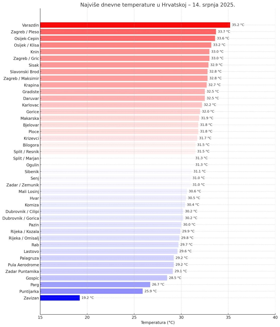 Danas će biti pretežno sunčano i natprosječno toplo. U noći burin, na moru sjeverozapadnjak. Danju će puhati vjetar zapadnih smjerova, prema otvorenom sjeverozapadnjak koji će najjači biti u kasnim popodnevnim satima kada među otocima prolazno može imati vrlo jake udare. Od jutra natprosječno toplo. Minimalne jutarnje temperature zraka bit će od 17 do 22°C u Dalmatinskoj zagori, od 22 do 27°C uz obalu i na otocima. Najviše dnevne temperature većinom od 30 do 36°C.