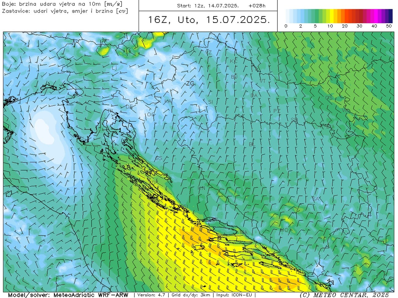 Srijeda donosi slične vremenske prilike. Zadržat će se stabilno i pretežno sunčano. Ujutro i navečer slaba bura, danju će puhati maestral, a popodne na moru umjeren, prolazno i pojačan vjetar zapadnih smjerova. Krajem dana podno Velebita umjerena do jaka bura. Jutarnje temperature bez veće promjene, najviše dnevne od 29 do 35°C.