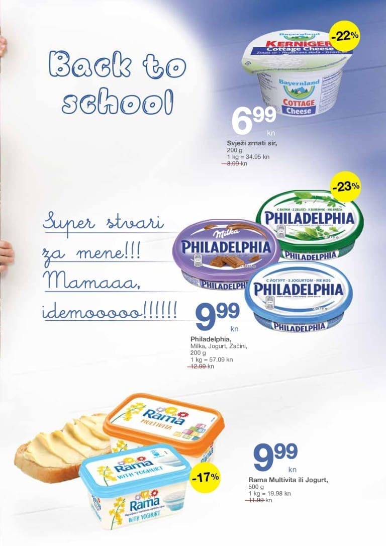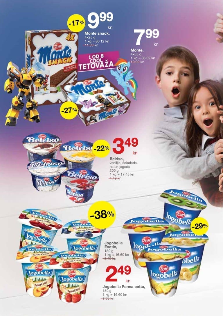 Kako bi se naši školarci zasladili potražite omiljene Zott slastice. Nezaobilazni Monte s cool tetovažama po odličnoj cijeni od 7.99 kn. Za one koji vole neobične okuse tu je Jogobella Exotic i Jogobella Panna Cotta za samo 2.49 kn.