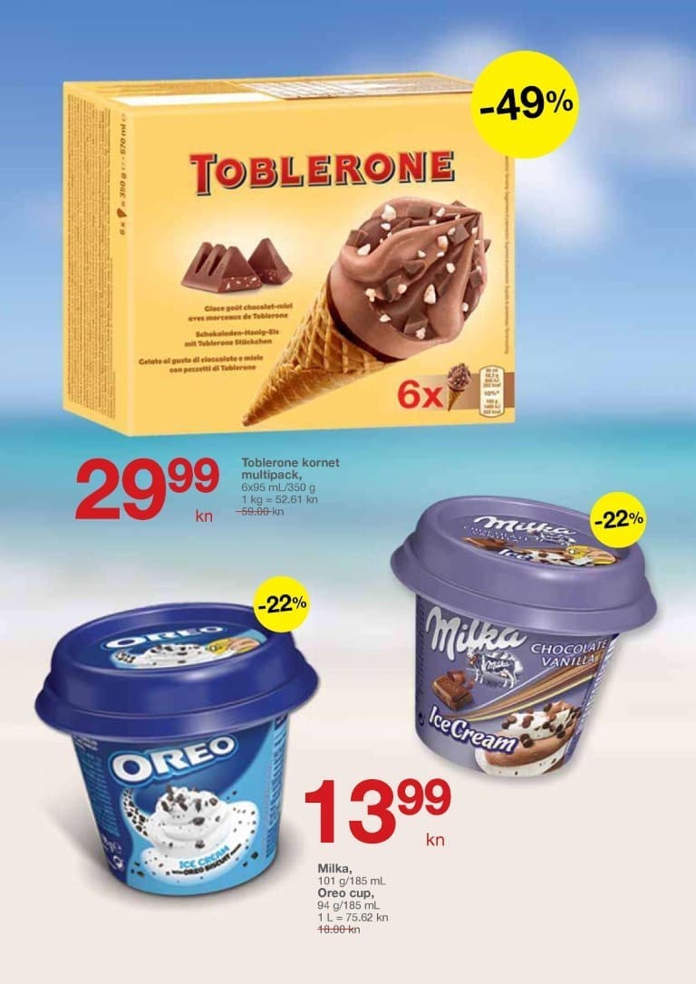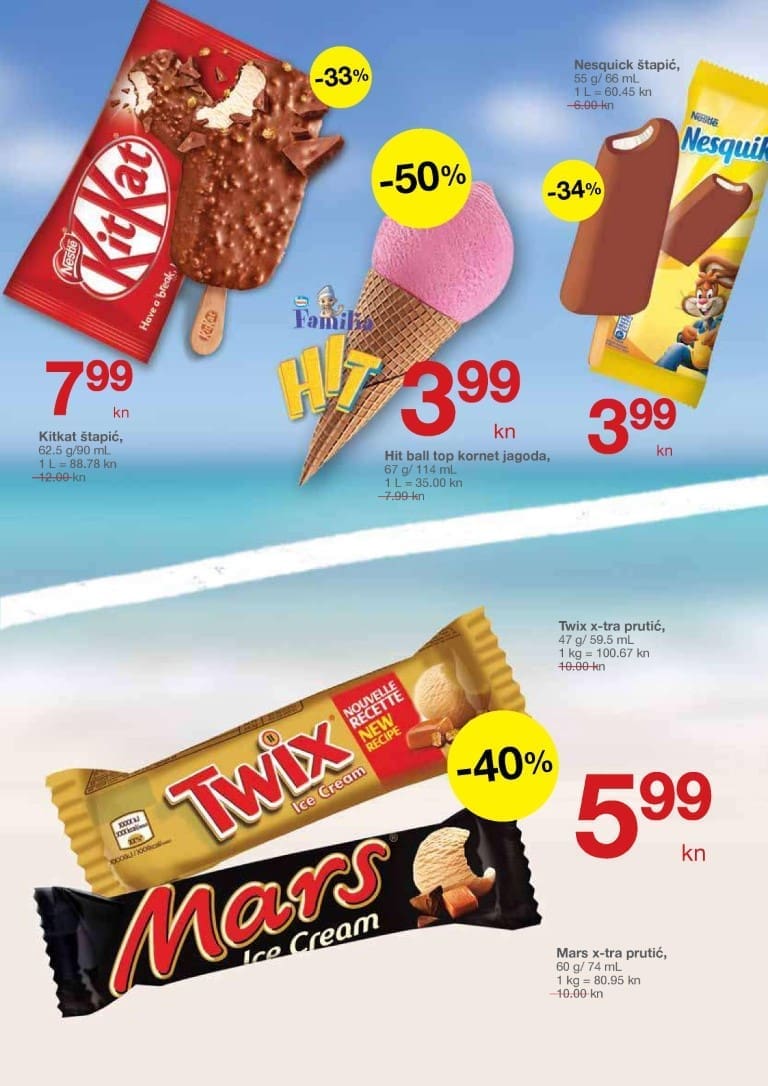 Ovaj tjedan potražite i slasne Mars i Twix sladolede po 5.99 kn! Za najmlađe sladoledoljupce donosimo Nesquik sladoled za samo 3.99 kn. Za ljubitelje sladoleda iz čašica izdvajamo Milka i Oreo čašicu od 185 ml za samo 13.99 kn.