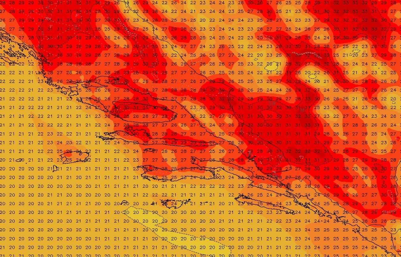 U četvrtak, petak, subotu i nedjelju pretežno vedro. Vjetar većinom slab; noću burin, danju maestral, jedino je u petak na moru moguće prolazno slabo jugo. Bit će vrlo toplo i vruće s najvišim dnevnim temperaturama od 26 do 32°C.
