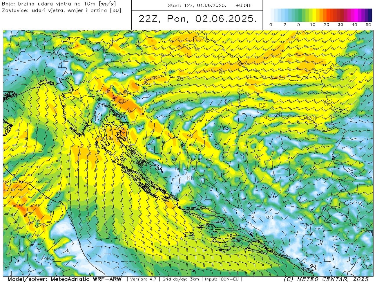 U utorak pretežno ili djelomično sunčano i suho. Puhat će umjereno, na moru prolazno i pojačano jugo, slabit će prema kraju dana. Jutarnje temperature u blagom porastu, najviše dnevne većinom od 23 do 28°C.
