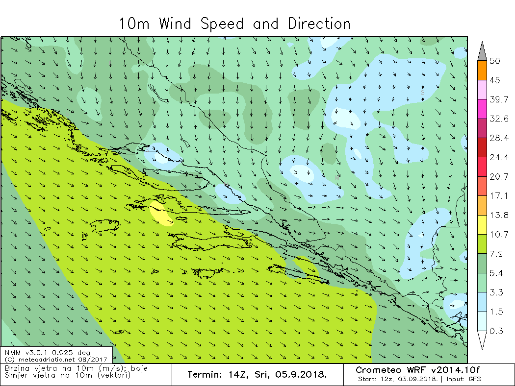 Još stabilnije će biti u pretežno sunčanu srijedu u kojoj će izostati popodnevni pljuskovi. Noću tiho, danju će puhati umjeren zapadnjak koji na otvorenom i među otocima prolazno može imati pojačane udare u kasnim popodnevnim satima. Jutarnje temperature bez promjene, a najviše dnevne će porasti pa će biti većinom od 27 do 31°C.
