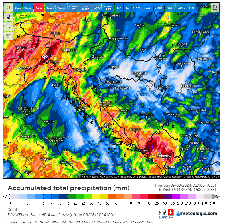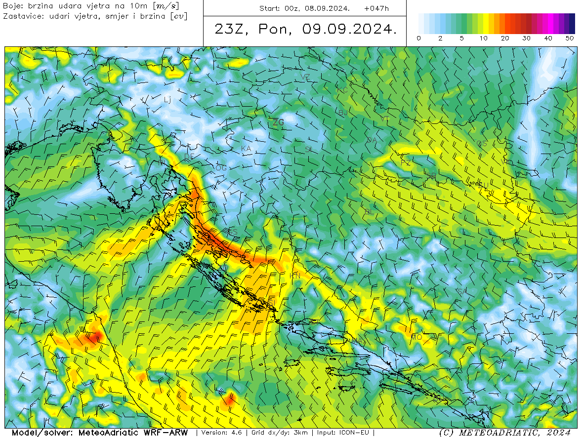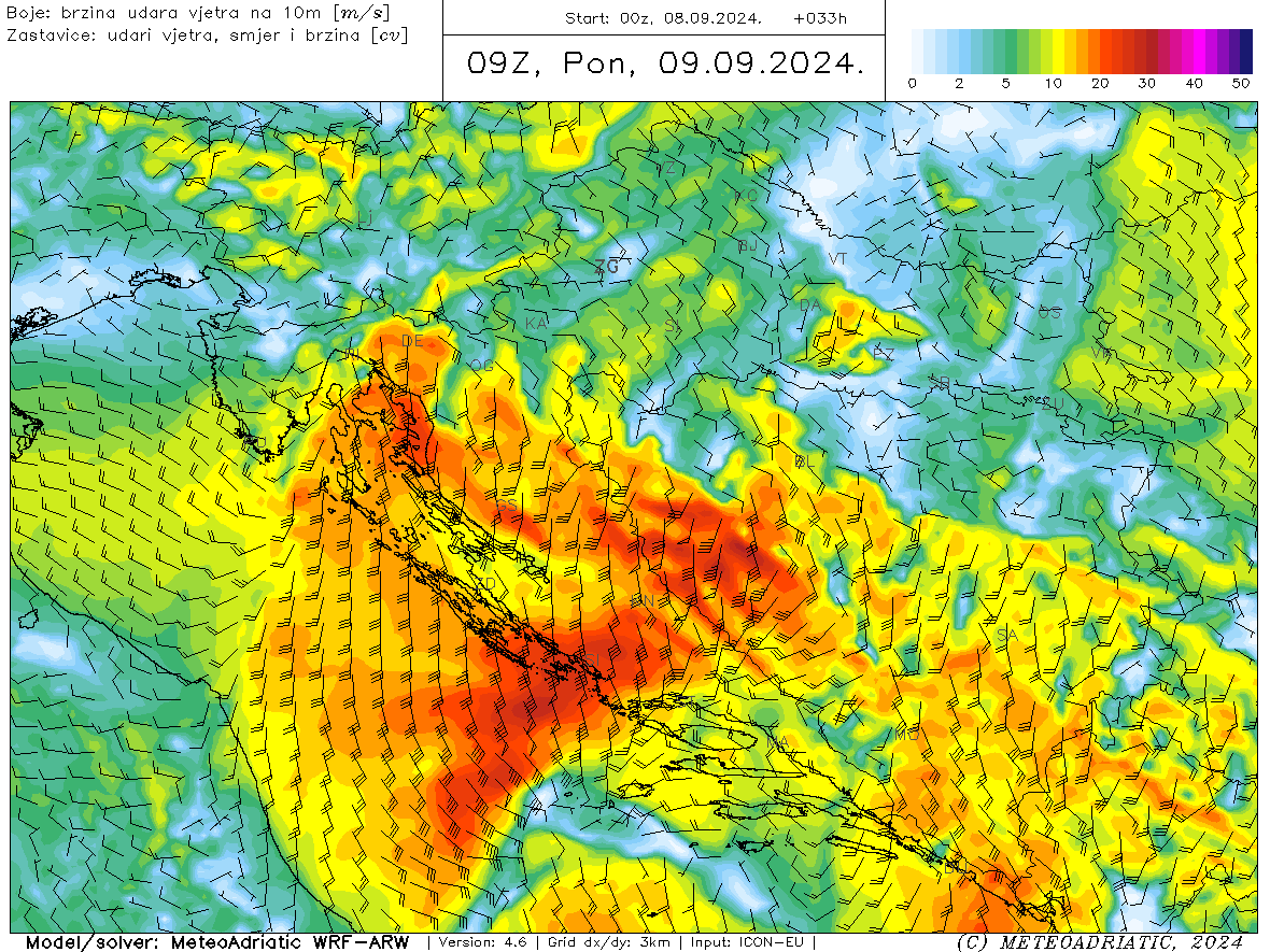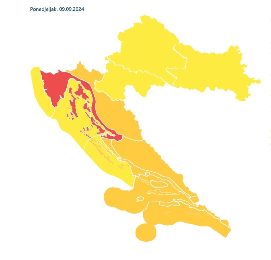DHMZ je izdao narančasti stupanj upozorenja na veći dio Jadrana, a za sjeverni i crveni. Ipak, ekstremnih oborina u Dalmaciji s ovom promjenom ne bi trebalo biti, naprotiv, neki dijelovi Dalmacije dobit će ispod 15 litara tijekom ponedjeljka. Ipak, prognostički modeli za područje krajnjeg juga, od Konavala prema Boki Kotorskoj predviđaju mogućnosti i stotinjak litara oborine sljedeća 24 sata.