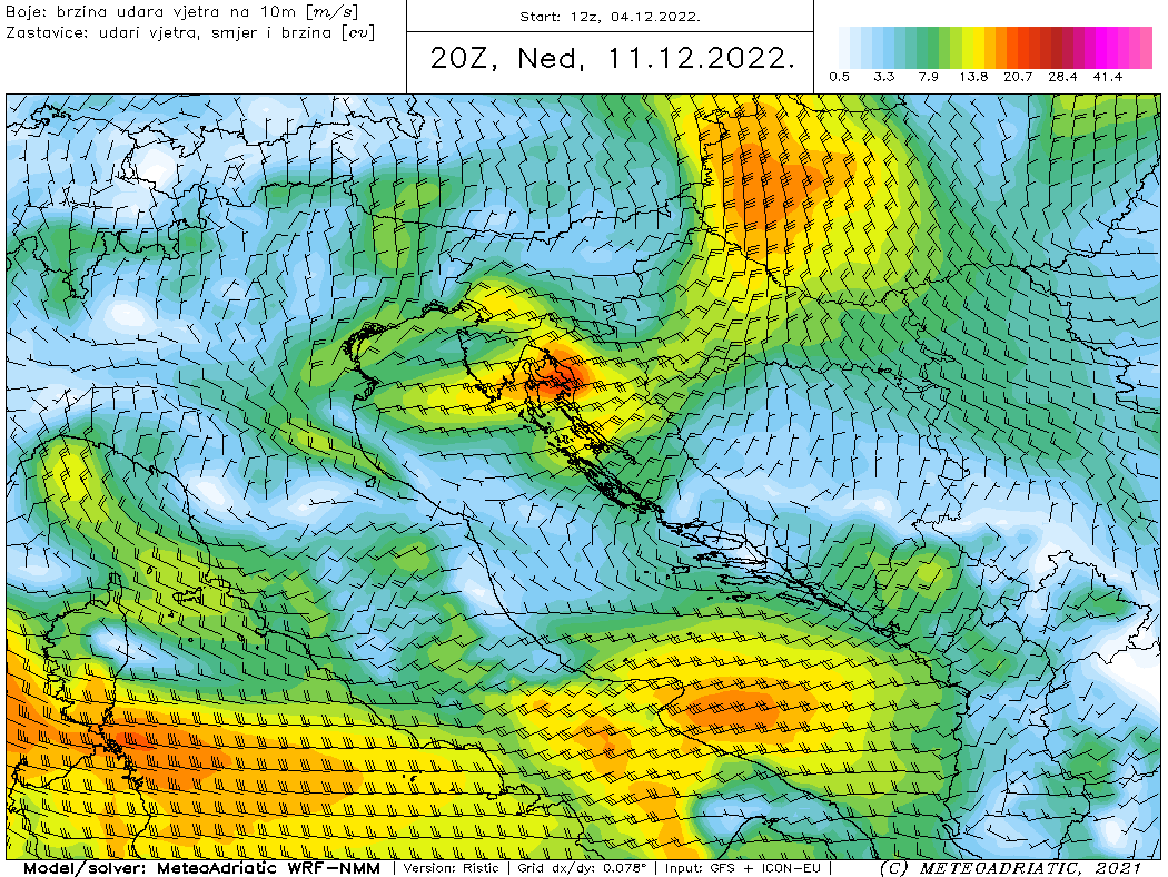 U nedjelju još u noći kiša, a u planinama će kiša prijeći u snijeg. Tijekom dana prestanak oborina i djelomično razvedravanje. Na sjevernom Jadranu će puhati umjerena do jaka bura, a južnije od Šibenika vjetar neće biti značajan. Postupno hladnije, osobito navečer.