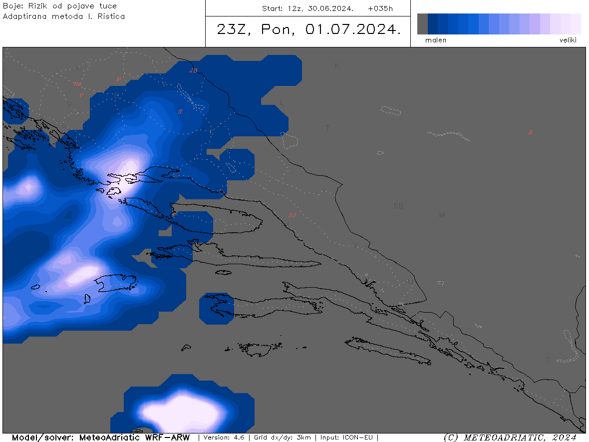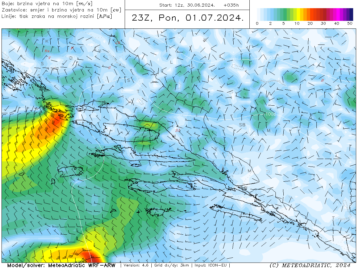 Veći dio ponedjeljka bit će pretežno sunčan i suh. Navečer, osobito prema sredini noći, bit će promjenjive naoblake, ponegdje sa slabom kišom ili pljuskovima s grmljavinom. Sredinom noći na moru srednjeg Jadrana ponegdje su mogući izraženiji neverini. Ujutro će puhati slab do umjeren sjeverozapadnjak i burin, danju jugozapadnjak. Kasno navečer na sjeveru Dalmacije može biti umjerene tramontane, na moru s jakim udarima. Minimalne jutarnje temperature zraka od 18°C ponegdje u Dalmatinskoj zagori do 28°C ponegdje uz obalu i na otocima. Najviše dnevne temperature od 29 do 34°C.