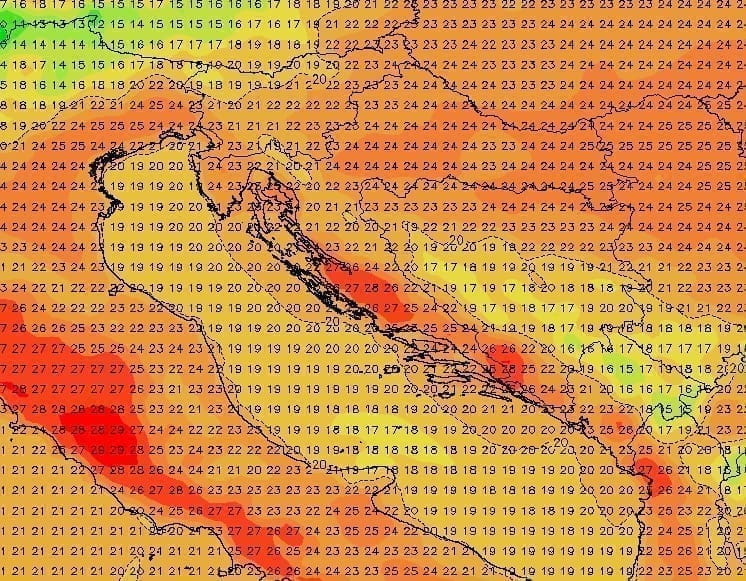 Srijeda donosi pretežno sunčano i suho vrijeme. Noću tiho ili burin, danju slab, a popodne umjeren vjetar zapadnih smjerova koji kasno popodne na otvorenom prolazno može biti pojačan. Srijeda bi mogla biti najtopliji dan tjedna u koje će najviše dnevne temperature biti od 23 do čak 28°C.