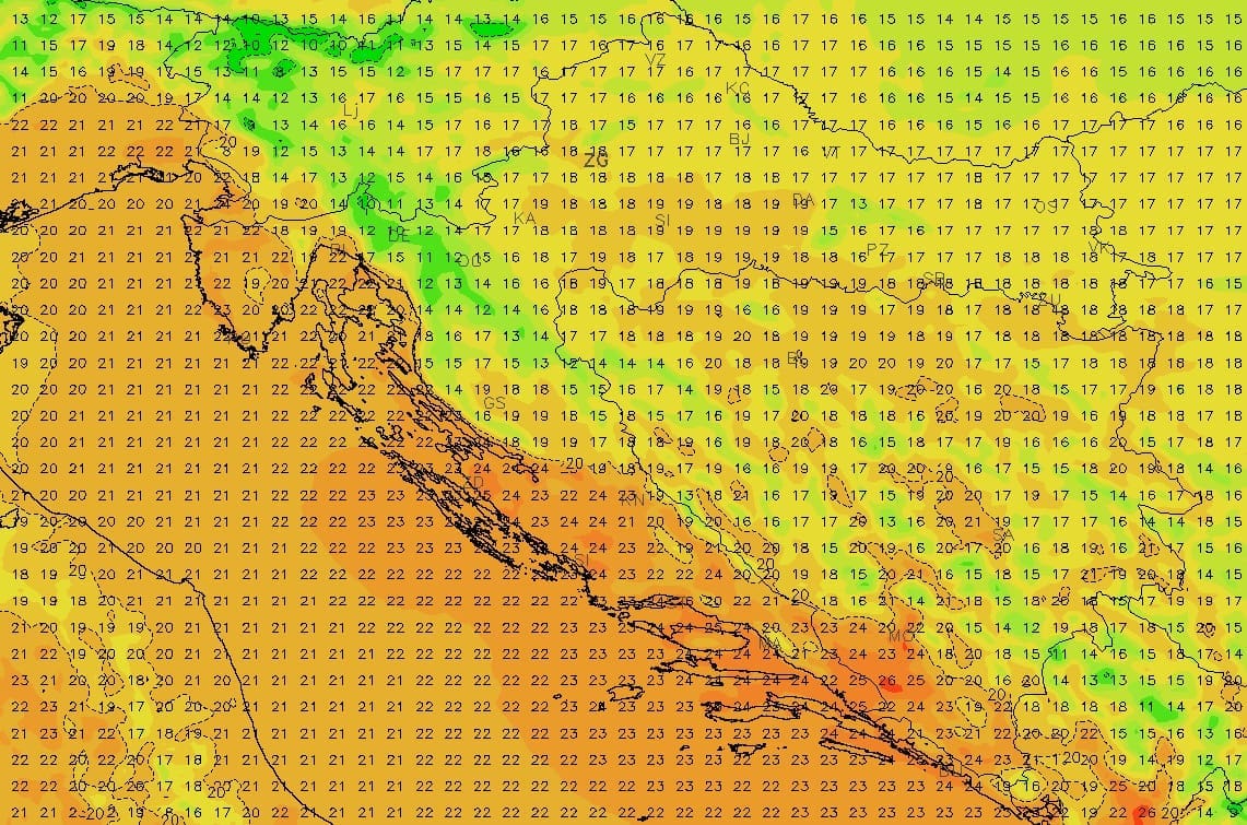 Vrlo slično vrijeme očekuje nas u promjenjivo oblačan petak. Puhat će umjereno jugo koje na moru može imati pojačane udare. Razlika između jutarnjim i popodnevnim temperatura bit će male, a najviše dnevne temperature bit će od 18 do 23°C.