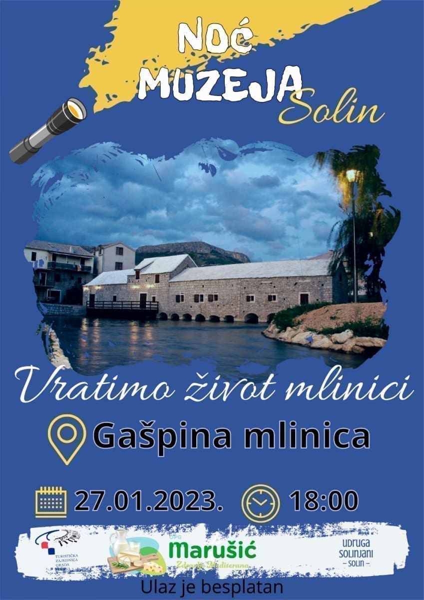 U sklopu Noći muzeja u Gašpinoj mlinici održat će se manifestacija “Vratimo život mlinici” koju organizira TZ grada Solina s udrugom Solinjani i novim koncesionarom Gašpine mlinice (OPG Marušić). Manifestacijom se želi prikazati kako je izgledao život u mlinici u stara vremena kroz odjeću, hranu i izložene artefakte te vođeni obilazak mlinice.