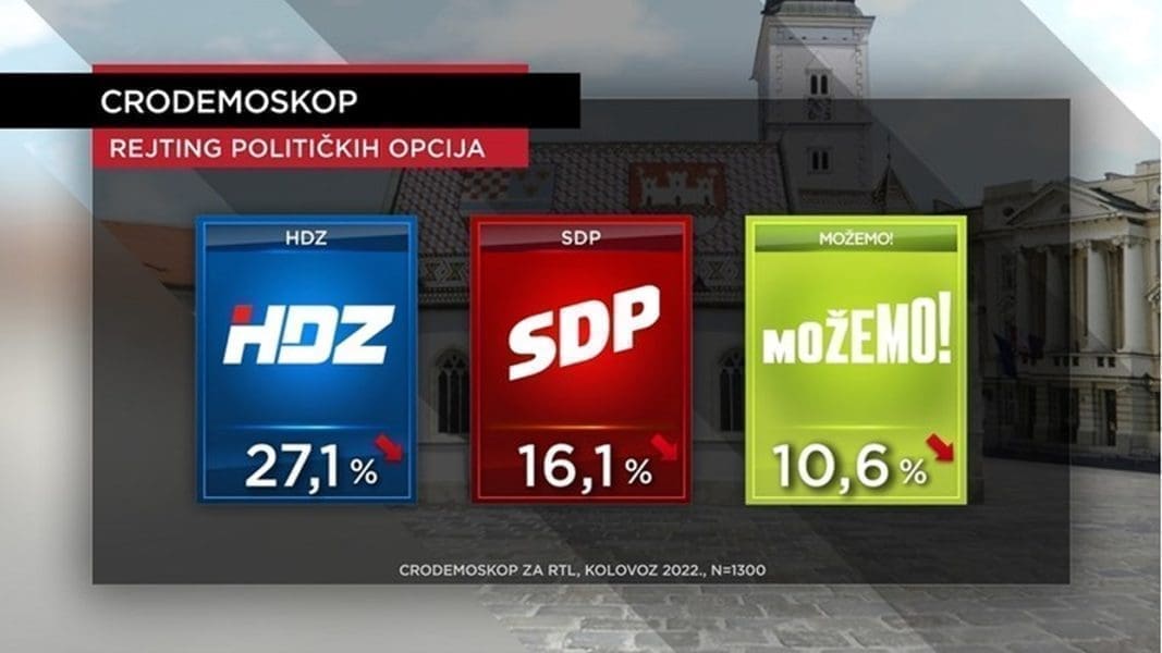 Objavljenje novi CRO Demoskop. HDZ je i u kolovozu prva opcija hrvatskih birača, ali prvi put u četiri mjeseca u padu, stoji u istraživanju koje je nastalo u suradnji RTL-a i Promocije plus. Nalaze se na vrhu ljestvice rejtinga stranaka s izborom od 27,1 posto (srpanj 27,3 posto).