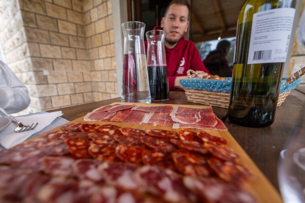 Prošlog su ljeta primali male, gotovo slučajne grupe iz Cavtata; ove sezone već imaju rezervirane termine hotelskih sommeliera i eno-gastro blogera. Degustacija počinje kobasicama, prelazi na ružičastu pancetu („disciplinirani“ komad koji se suši osam mjeseci), a kulminira tanko rezanim pršutom posluženim uz čašu malvasije iz susjednog vinograda i komadić svježeg kruha premazanog domaćim maslinovim uljem.