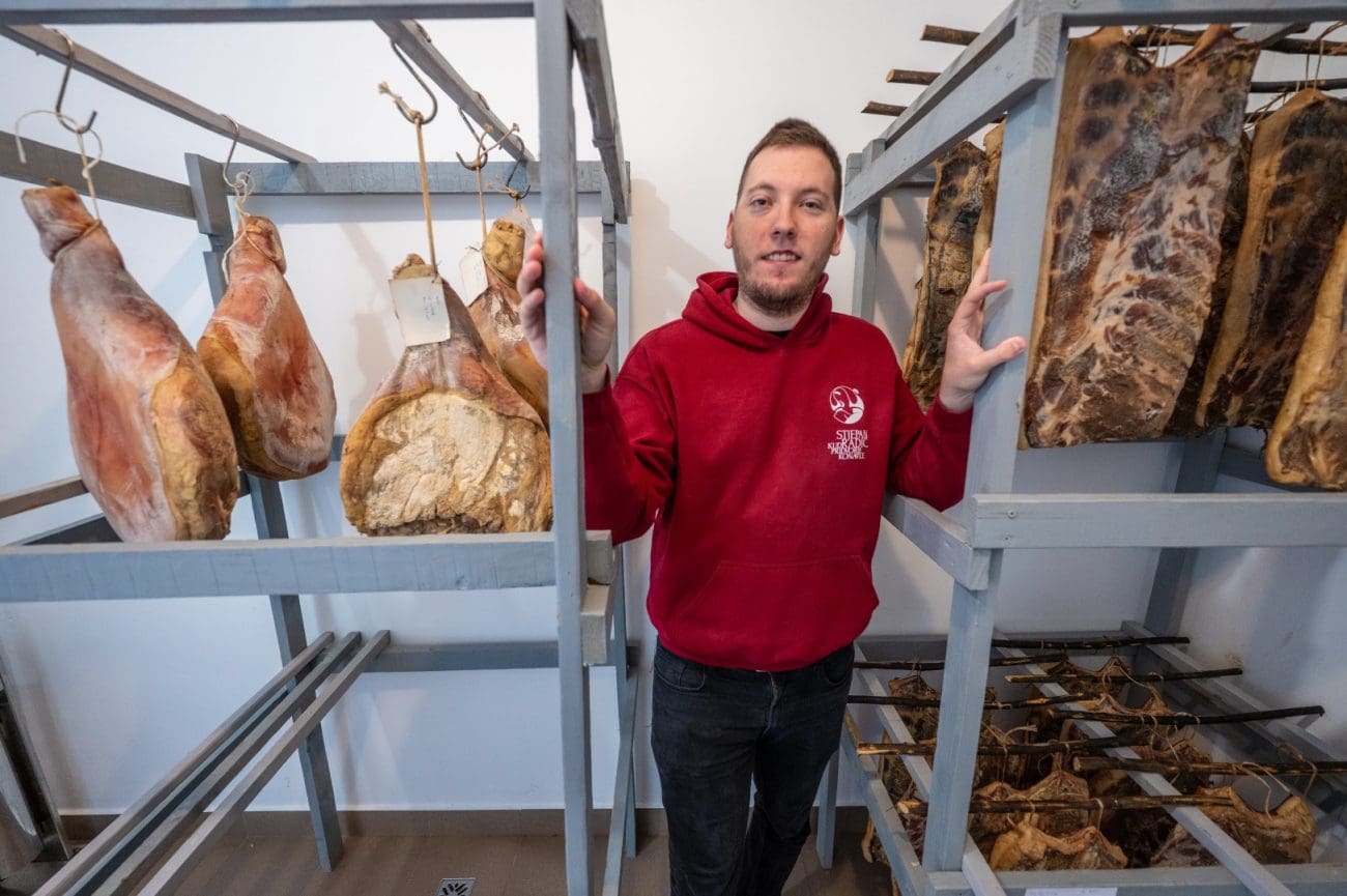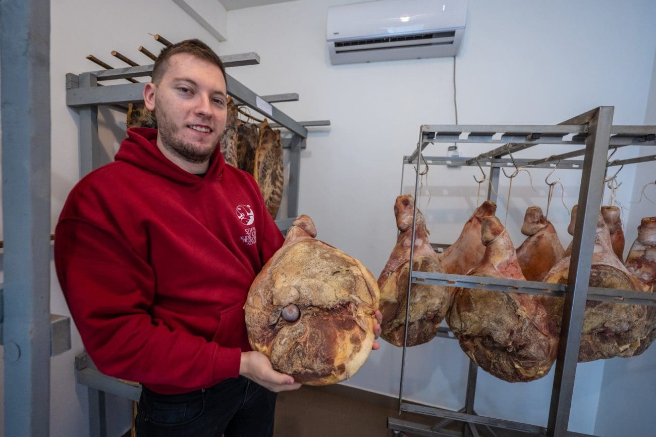 Kobasice su sprint prema tržištu: 30 do 35 dana, ovisno o vlažnosti zraka, i spremne su za vakuumiranje. Crvena verzija, začinjena slatkom paprikom i prstohvatom ljutine, nastala je iz praktične želje da se na stolu razlikuje „obična“ i „pikant“. No gostima se toliko svidjela da je danas traženija od klasične.