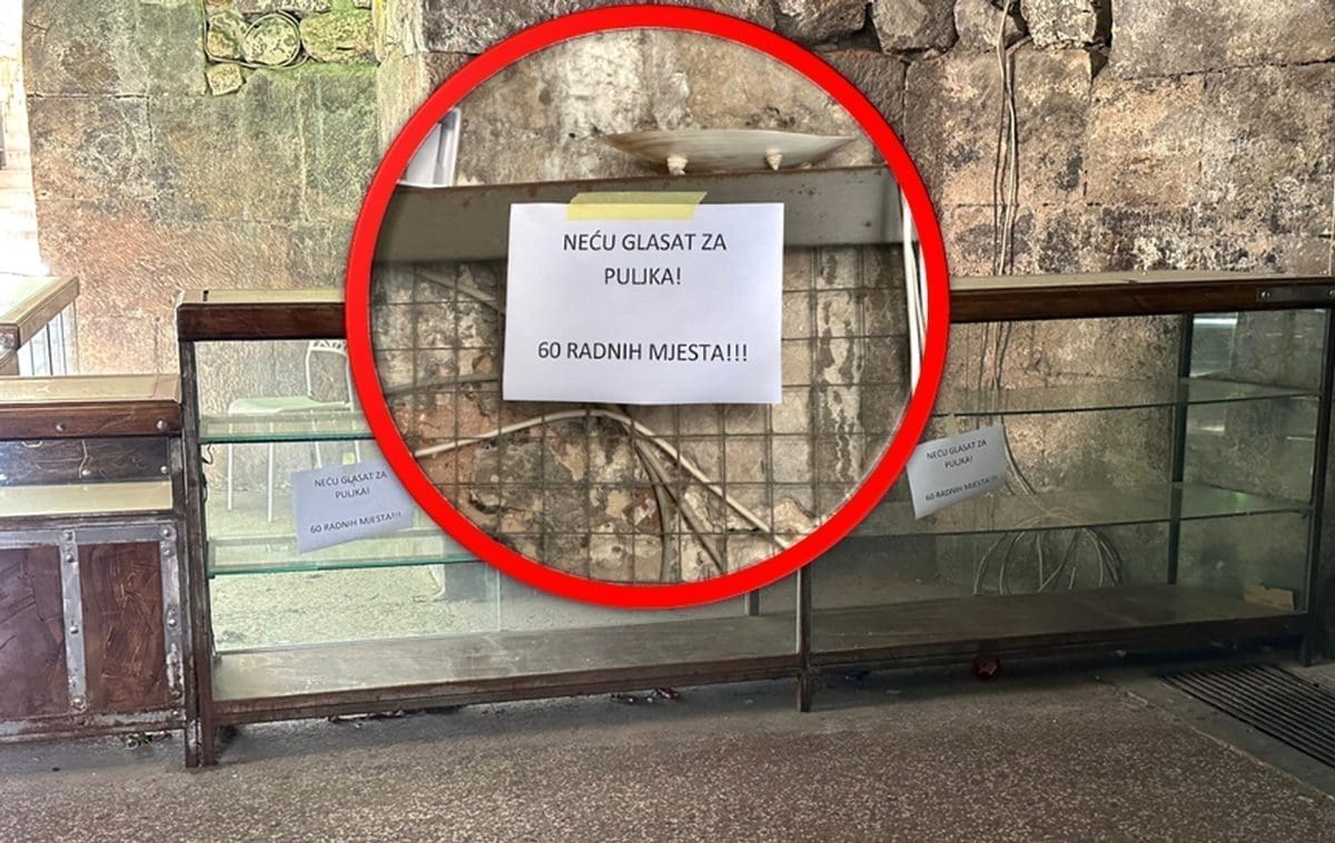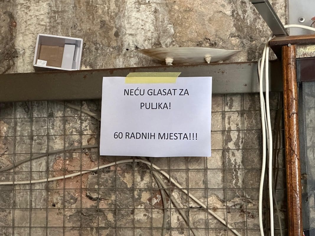 "Neću glasat za Puljka. 60 radnih mjesta", piše na papirima.
