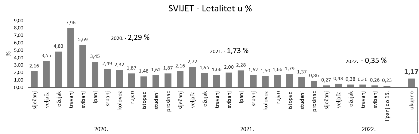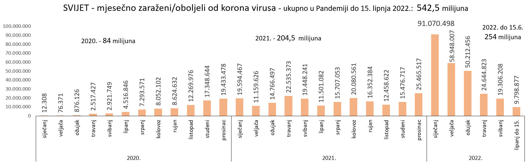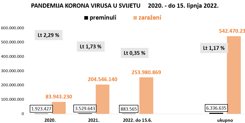 Iz priloženih grafikona razvidno je da je u ukupno kroz dvije i pol godine do 15. lipnja 2022. zabilježeno više od 540 milijuna zaraženih i 6,34 milijuna preminulih s ukupnim letalitetom 1,17%.