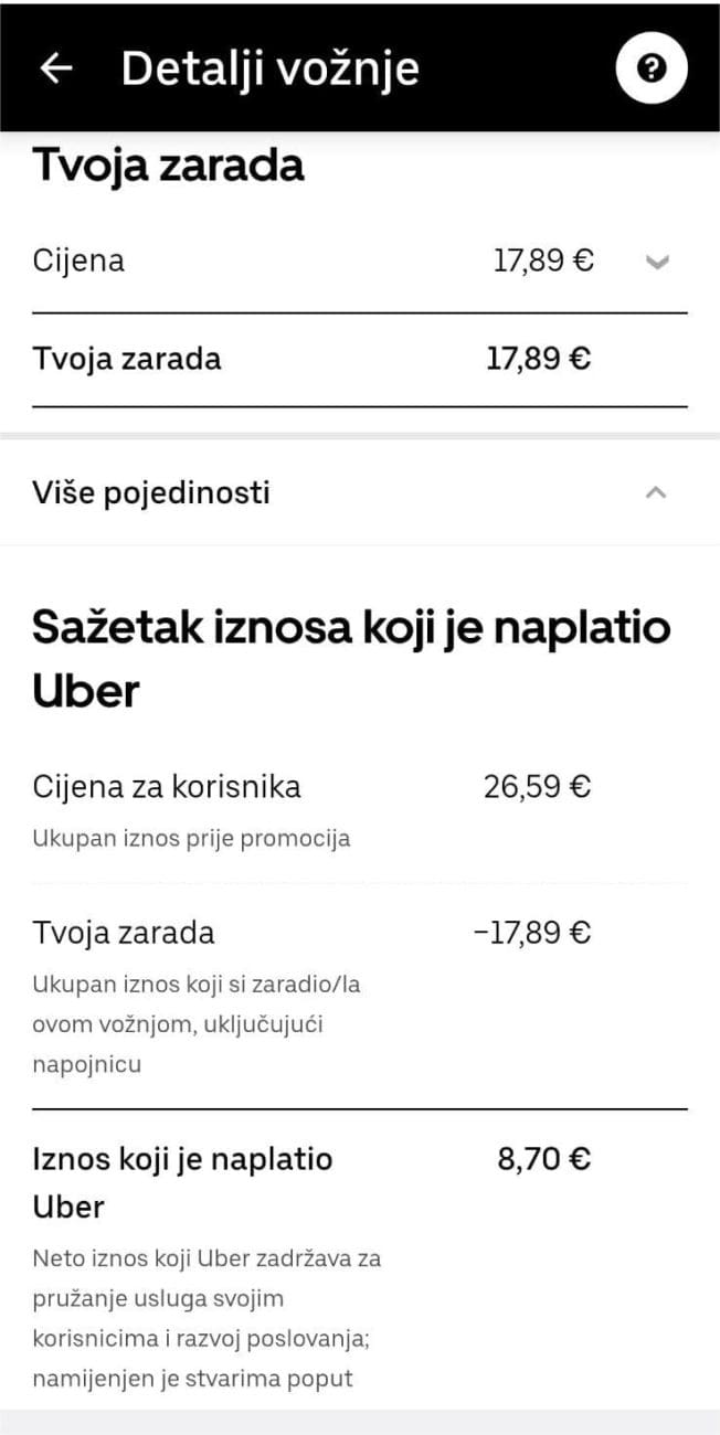 Cijena koju je putnik platio iznosila je 17,98 eura, no iznos koji je sam vozač dobio bio je tek 9,28 eura. Preostali dio, čak 8,70 eura, zadržao je Uber.