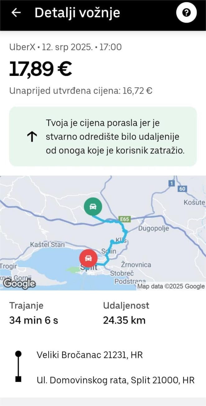 Dostavio je snimku zaslona iz aplikacije, koja prikazuje detalje njegove nedavne vožnje. Riječ je o ruti od Velikog Broćanca (poštanski broj 21231) do samog centra Splita. Ukupna udaljenost iznosila je 24 kilometra, a vožnja je trajala 34 minute.