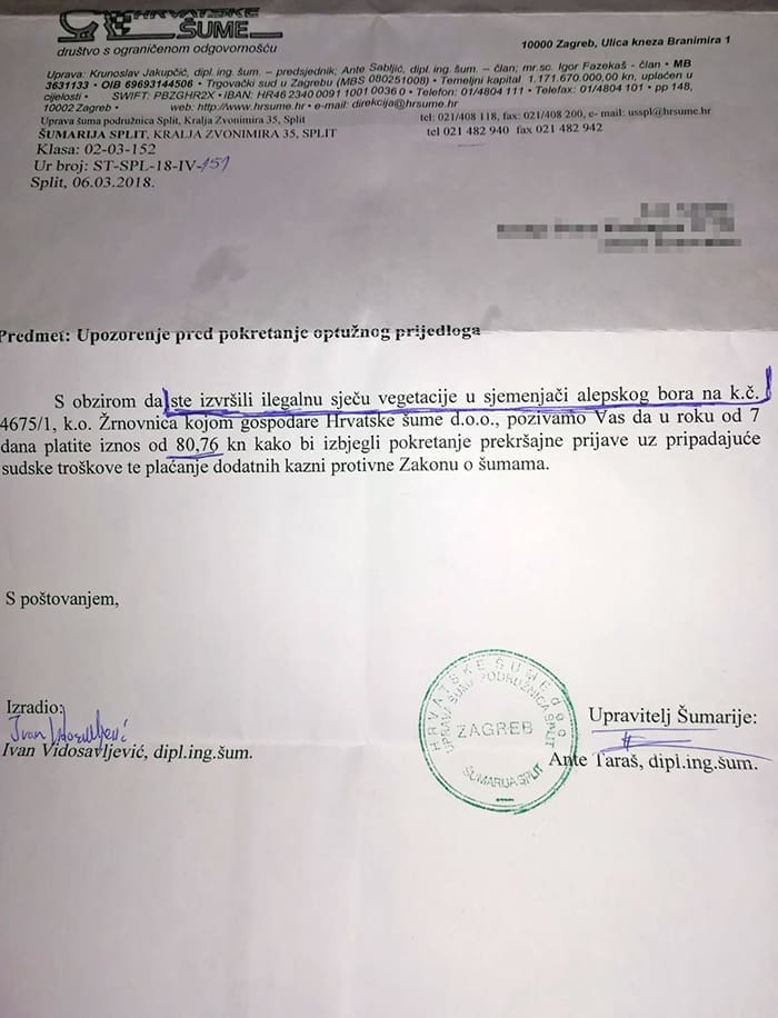 Kao da nije bilo dovoljno sve nabrojeno, nesretni Žrnovčani zadnjih su dana počeli dobivati upozorenja Hrvatskih šuma i to pred pokretanje optužnog prijedloga.