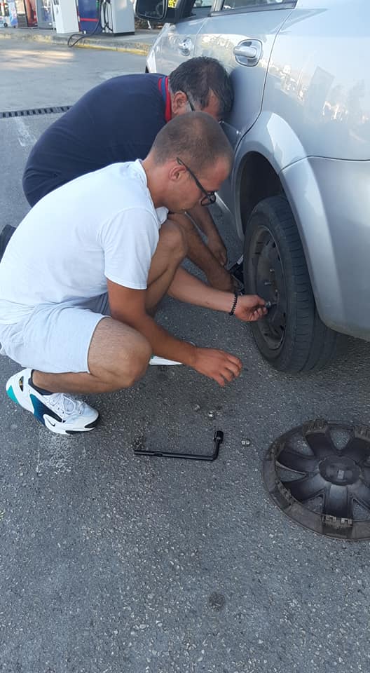Kad mi je vidio portapak, pale mu žunte i rekao "imam svoju rezervnu", ali smo izvadili moju te se prihvatio posla. Napumpao je i rezervnu! Imao je barbu s pumpe da pomogne ako treba, ali sve je sam odradio. Bez da je išta pitao.