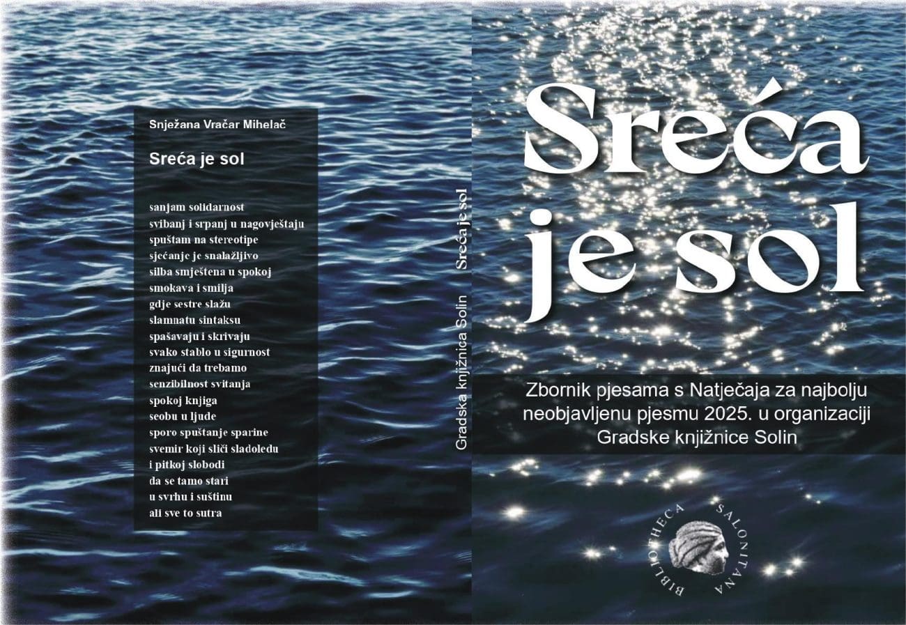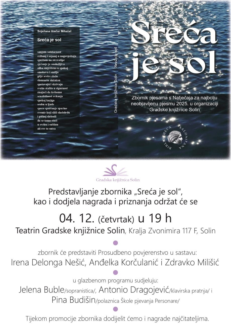Gradska knjižnica Solin poziva na predstavljanje zbornika 9. Natječaja za najbolju neobjavljenu pjesmu pod nazivom „Sreća je sol“. Zbornik nosi ime prema pobjedničkoj pjesmi autorice Snježane Vračar Mihelač, a predstavljanje će se održati u četvrtak, 4. prosinca, u Teatrinu GK Solin, s početkom u 19 sati.