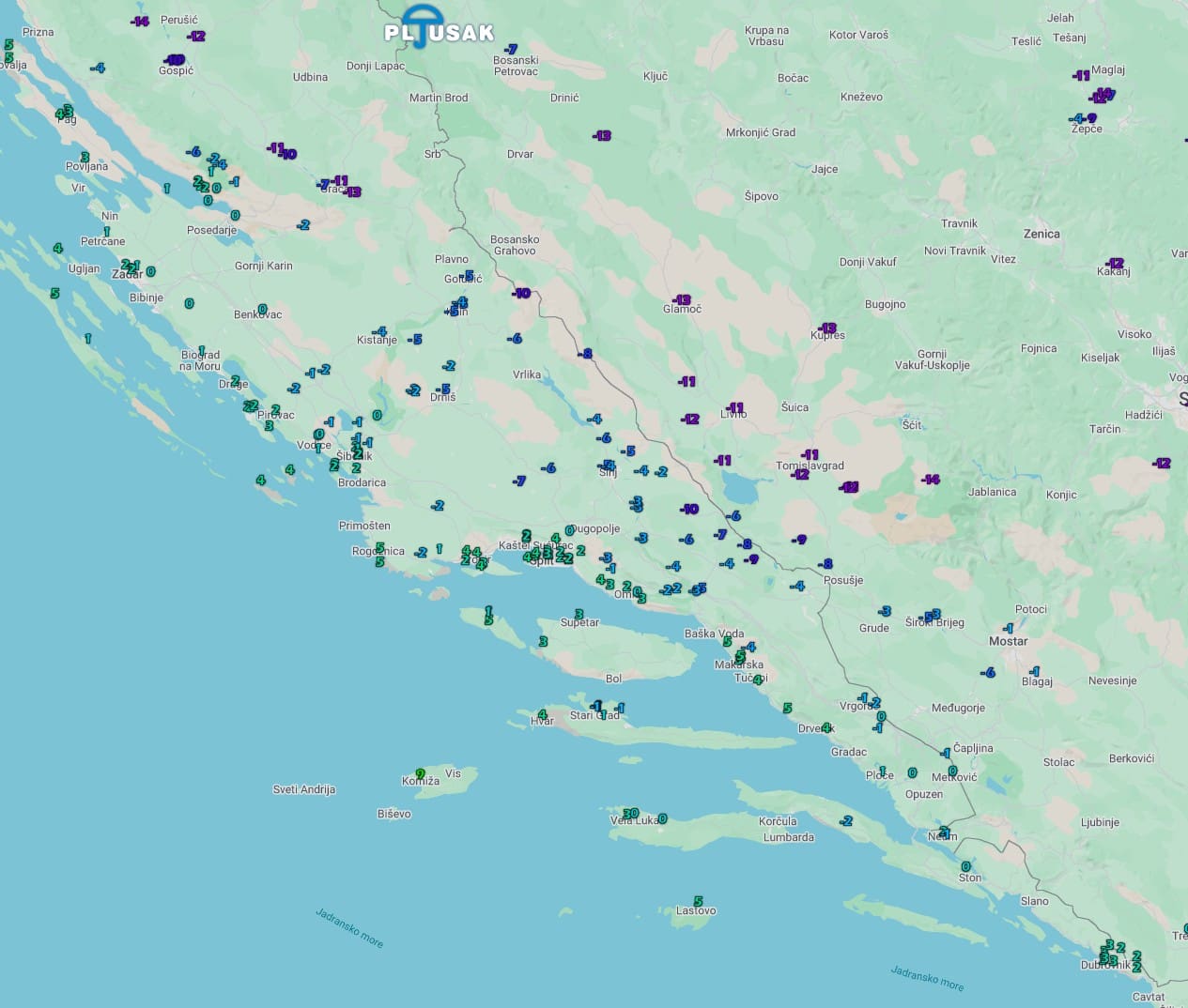 Nakon sunčanog i hladnog dana, aktualna večer donosi vrlo niske temperature zrak cijeloj zemlje. U 22:30 temperature u Dalmaciji su od 5°C na vanjskim otocima do čak -10°C u pojedinim kotlinama Dalmatinske zagore.