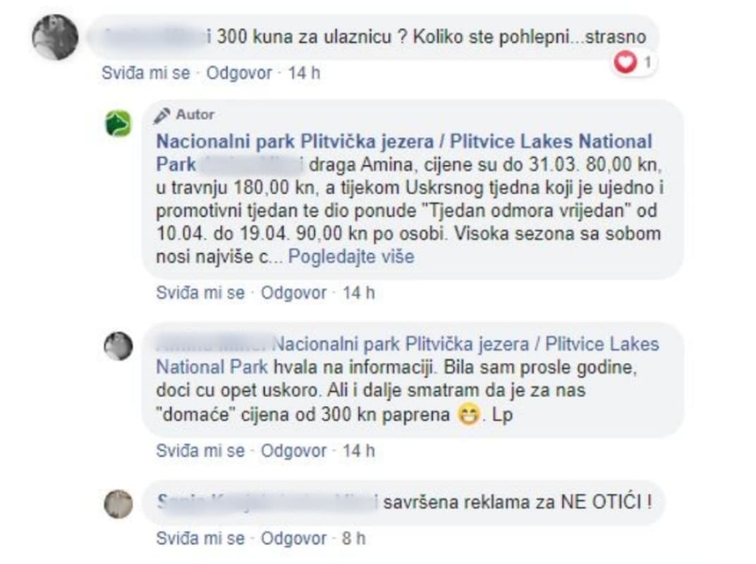 "Cijene su do 31.03. 80,00 kn, u travnju 180,00 kn, a tijekom Uskrsnog tjedna koji je ujedno i promotivni tjedan te dio ponude 'Tjedan odmora vrijedan' od 10.04. do 19.04. 90,00 kn po osobi. Visoka sezona sa sobom nosi najviše cijene te mi preporučamo svima dolazak u pred i post sezoni kada su cijene povoljnije, gužve manje i sveukupni doživljaj parka puno drugačiji u odnosu na ljetne mjesece", napisali su ženi koja se požalila da je karta od 300 kuna preskupa.