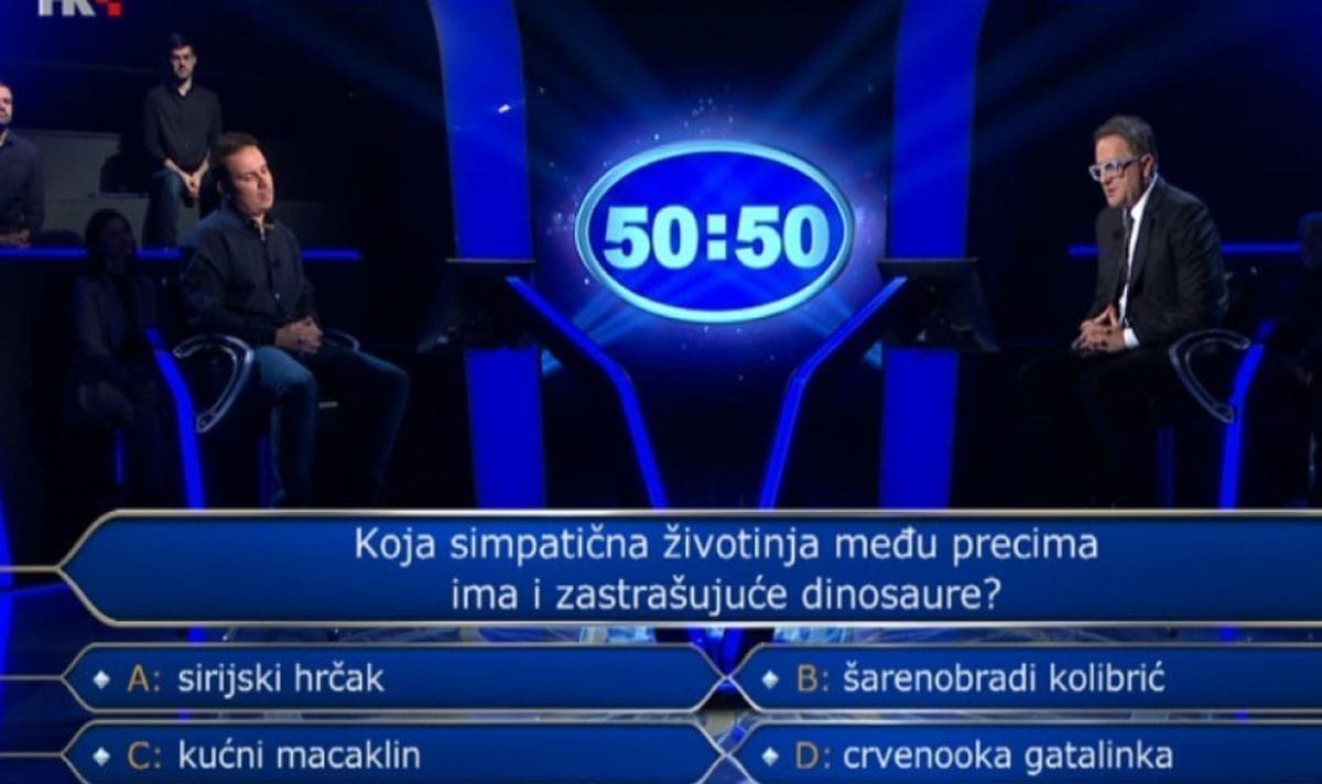 Koja simpatična životinja među precima ima i zastrašujuće dinosaure, glasilo je 13. pitanje za 250 tisuća kuna. A ponuđeni odgovori bili su: sirijski hrčak, šarenobradi kolibrić, kućni macaklin ili crvenooka gatalinka?