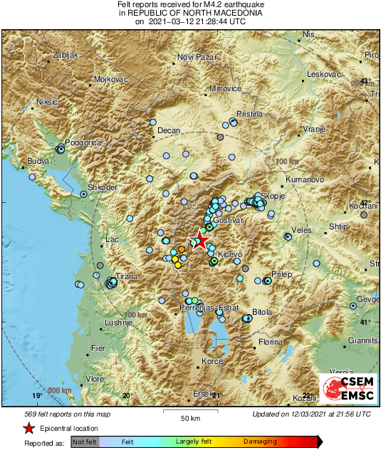 M4.4 #earthquake (#земјотрес) strikes 68 km SW of #Skopje (North Macedonia) 6 min ago. Effects reported by eyewitnesses: pic.twitter.com/SnCHtpPu5H