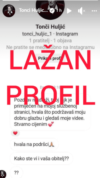 “Pozdrav najdraži, tvoj lajk je primijećen na mojoj službenoj stranici. Hvala što podržavaš moju dobru glazbu i gledaš moje videe. Stvarno cijenim”, pisalo je u prvoj poruci, nakon čega su upućeni emotikoni srca. “Hvala na podršci. Kako ste vi i Vaša obitelj?”, nastavila je osoba koja je ukrala Tončijev identitet te je inzistirala na daljnjoj komunikaciji.