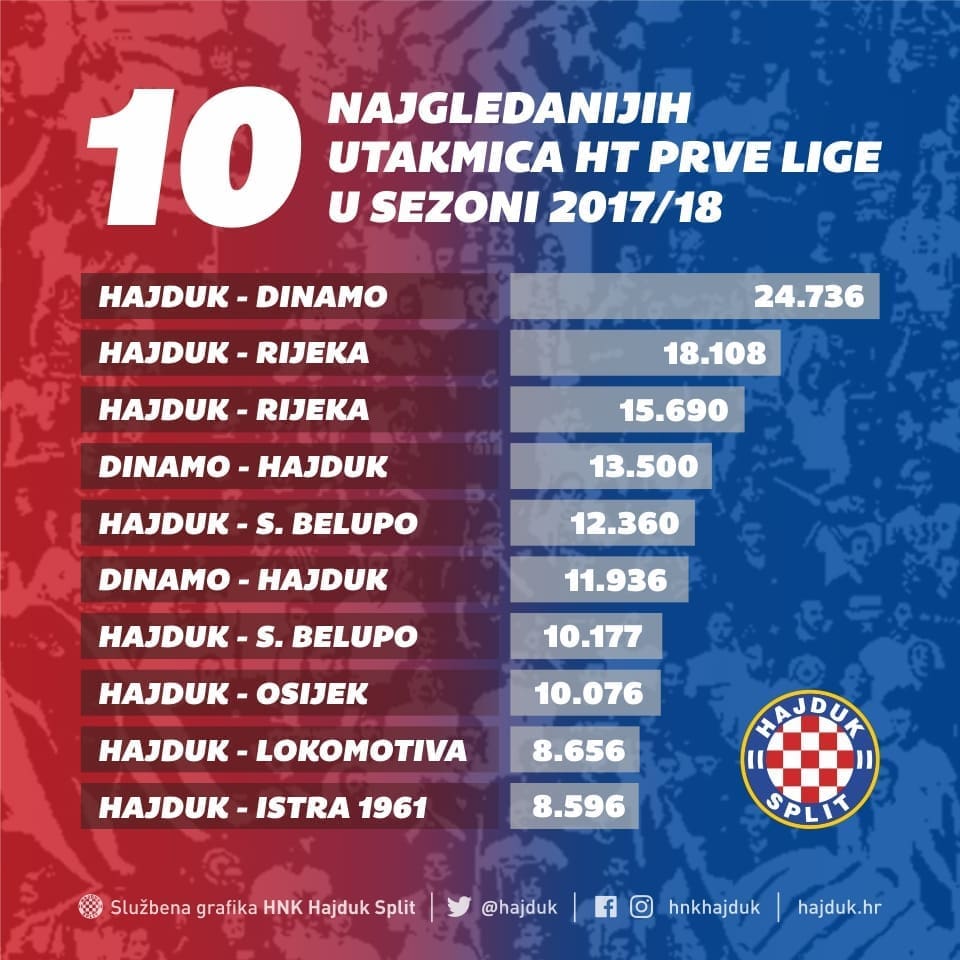 Susretom protiv Lokomotive u kojom su hajdukovci slavili rezultatom 1:0 Hajduk je ušao i sa svojom 10. utakmicom u tip 10 najgledanijih susreta lige.