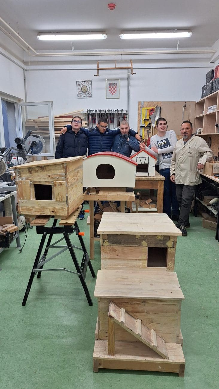 Prema ideji edukacijske rehabilitatorice Vlatke Arančić Krstulović i pod mentorstvom nastavnika praktične nastave Zvonimira Jerčića i Ante Dajaka, učenici su izradili tri drvene kućice namijenjene uličnim macama u Splitu, a nastavnik Matko Grubać se angažirao na tome da priča naših učenika izađe u javnost.