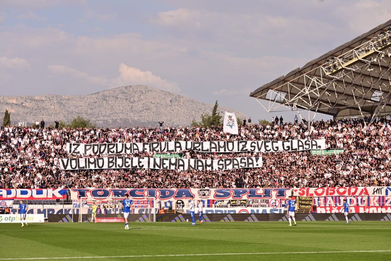 Uoči početka susreta s istočne tribine Poljuda začula se pjesma “Ja te volim, Hajduče!”, a Torcida je potom istaknula i transparent na kojem je pisalo:
