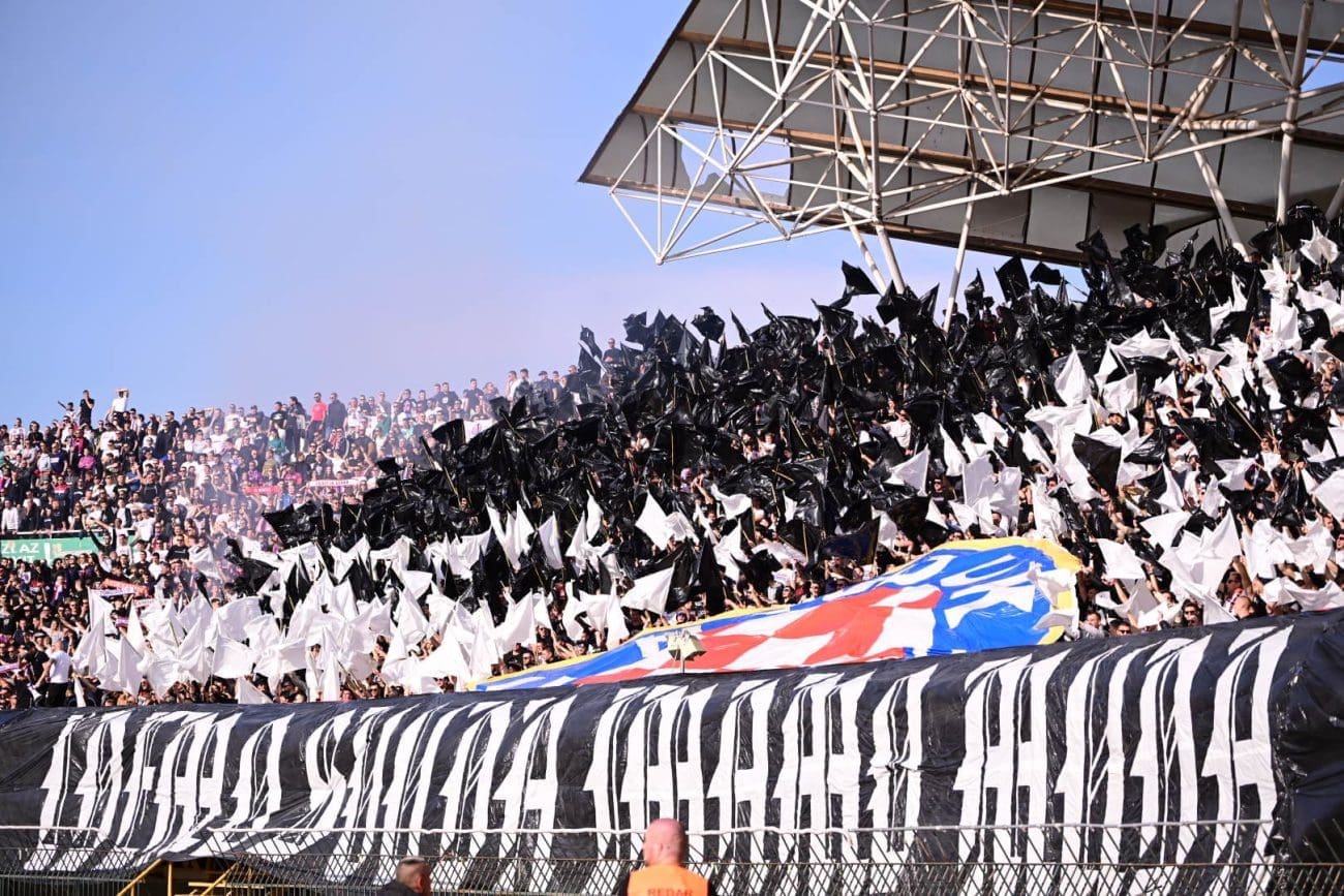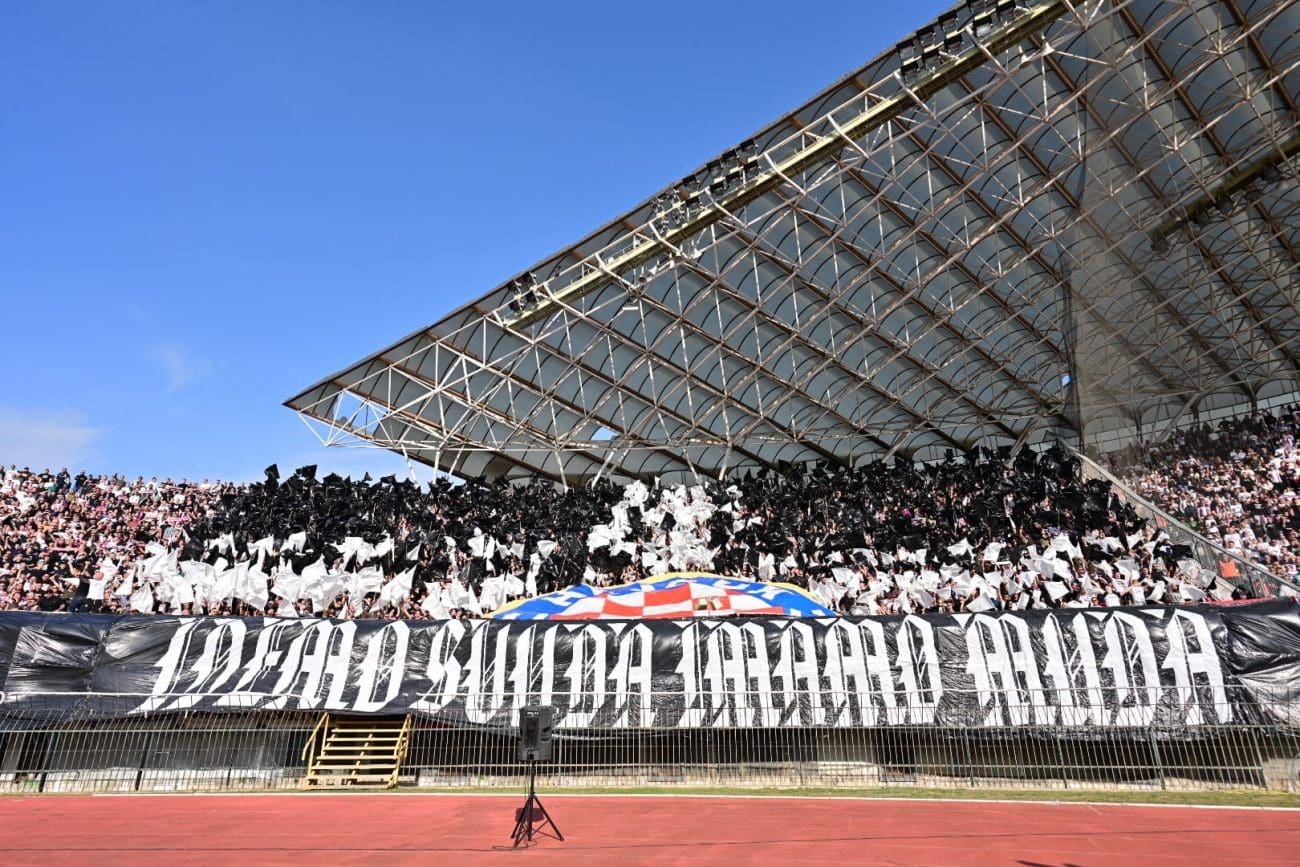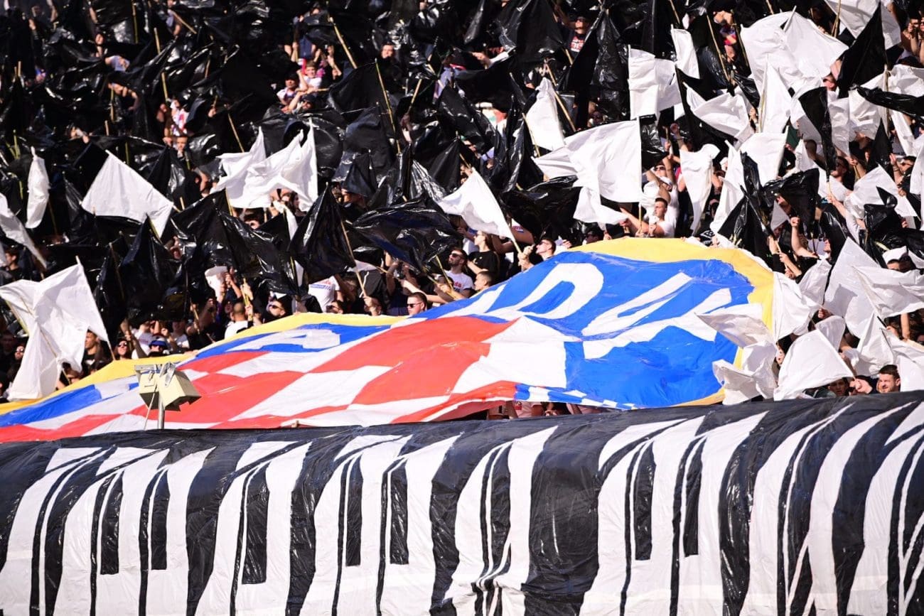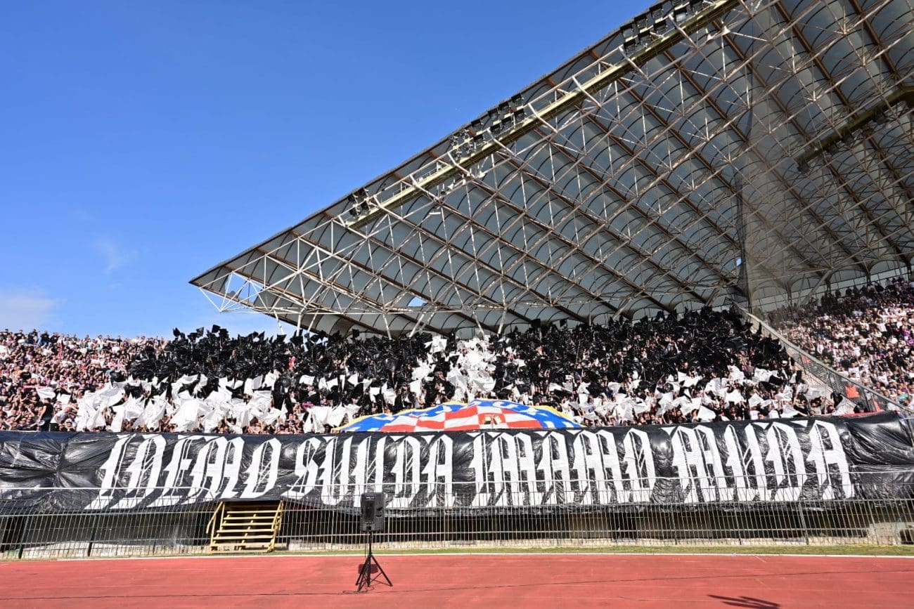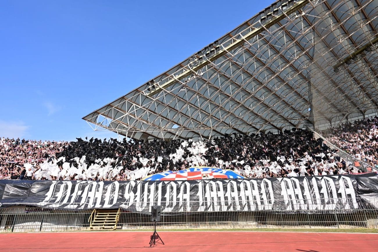 U 19. minuti Torcida je razvila koreografiju preko sjeveroistoka, pola je Hajdukova grba bilo iznad transparenta: "IDEMO SVUDA IMAMO MUDA", a ostatak je mahao crno-bijelim zastavama.