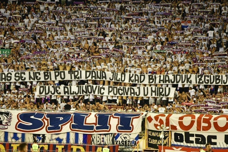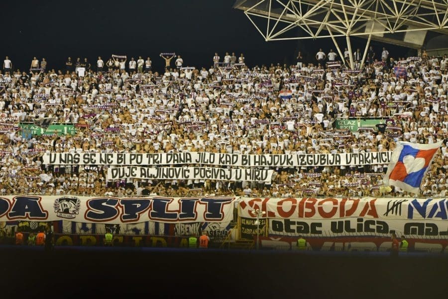 U prvoj utakmici trećeg pretkola Konferencijske lige Hajduk na Poljudu od 21 sat igra s Vitoriom Guimaraes. Torcida je za vrijeme drugog poluvremena podigla transparent u čast preminulom Srđanu Duji Aljinoviću legendarnom navijaču koji je Hajduka pratio još na Starom placu.