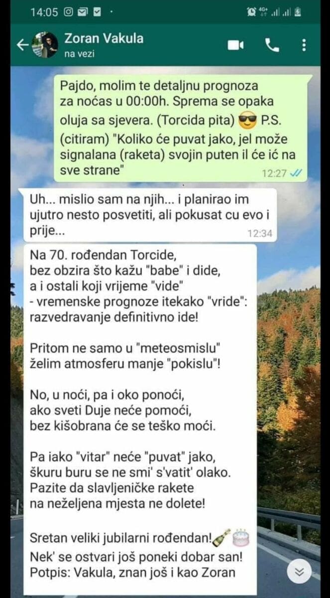 "Pajdo, molim te detaljnu prognozu za noćas u 00:00. Sprema se opaka oluja sa sjevera. (Torcida pita). P.S. citiram: Koliko će puvat jako, je l' može signalna (raketa) svojim putem ili će ići na sve strane?" - tako glasi upit koji je nepoznati pošiljatelj poslao našem poznatom meteorologu Zoranu Vakuli.