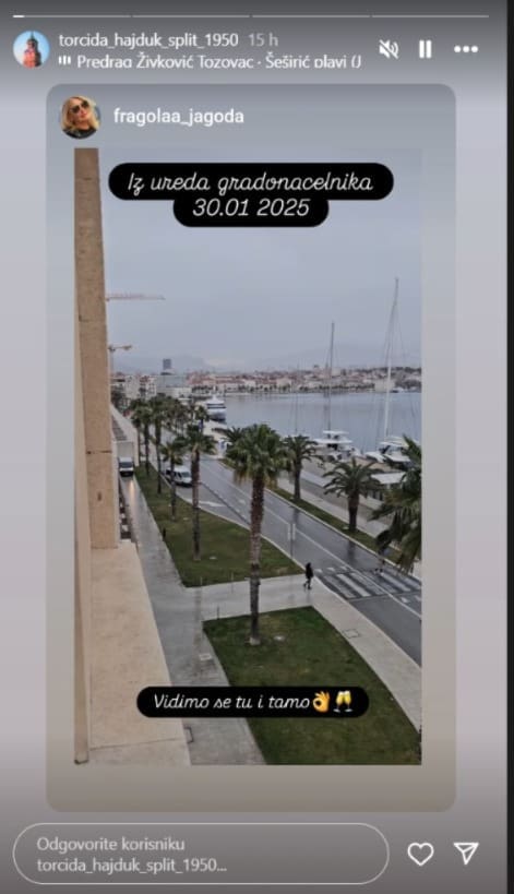 - Vidimo se tu i tamo - piše grofica uz videosnimke ili zajedničke fotografije s bračnim parom Puljak. Danas su njezine objave podijeljene na Instagram profilu 'Torcida_Hajduk_Split_1950'.