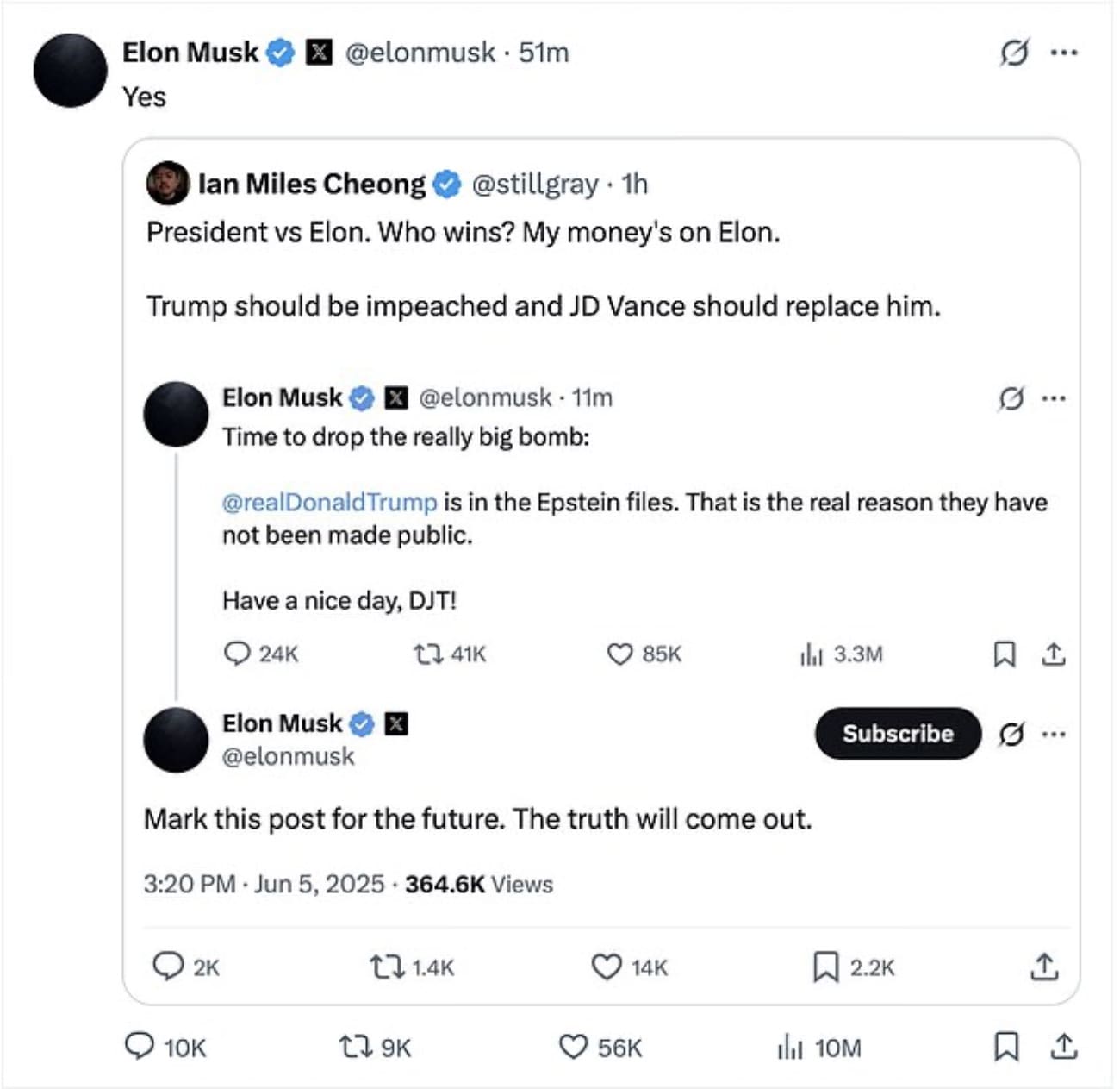 Na objavu konzervativnog komentatora Iana Milesa Cheonga – „Predsjednik protiv Elona. Tko pobjeđuje? Moje oklade su na Elona. Trumpa treba opozvati, a Vancea postaviti za predsjednika” – Musk je odgovorio kratkim, ali jasnim: „Da”.