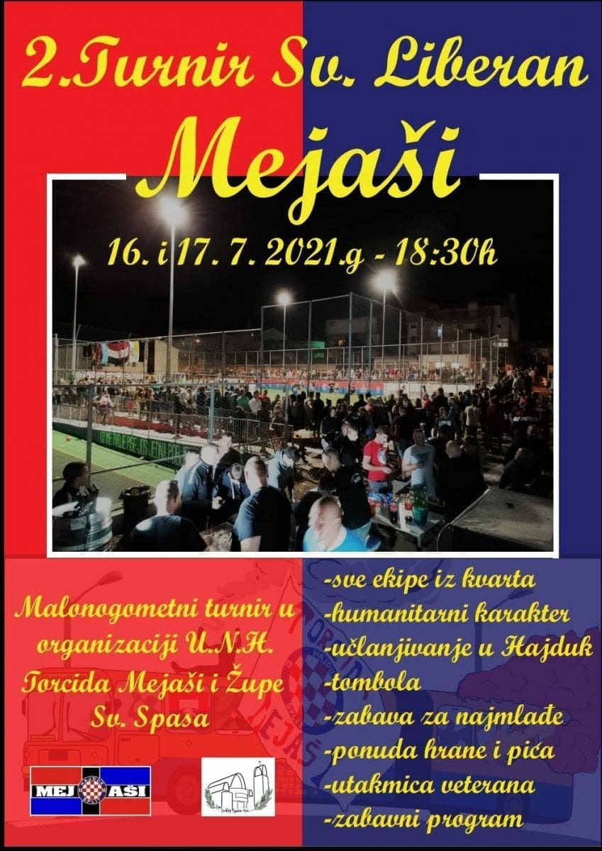 Drugi po redu malonogometni turnir pod nazivom "Sveti Liberan" održat će se u gradskom kotaru Mejaši dana 16. i 17. srpnja ove godine. Turnir organizira Udruga navijača Hajduka - Torcida Mejaši i Župa Svetog Spasa. Nastupit će kvartovske ekipe, turnir je humanitarnog karaktera, a na samom turniru moći ćete se učlaniti u Naš Hajduk. Za vrijeme trajanja turnira bit će organizirana zabava za svih, pa tako i za najmlađe, nastupit će i malonogometni veterani, a sudionici i gledatelji će moći uživati u jelu i piću.