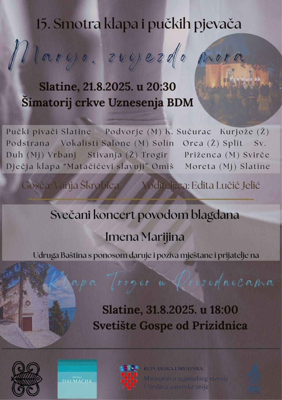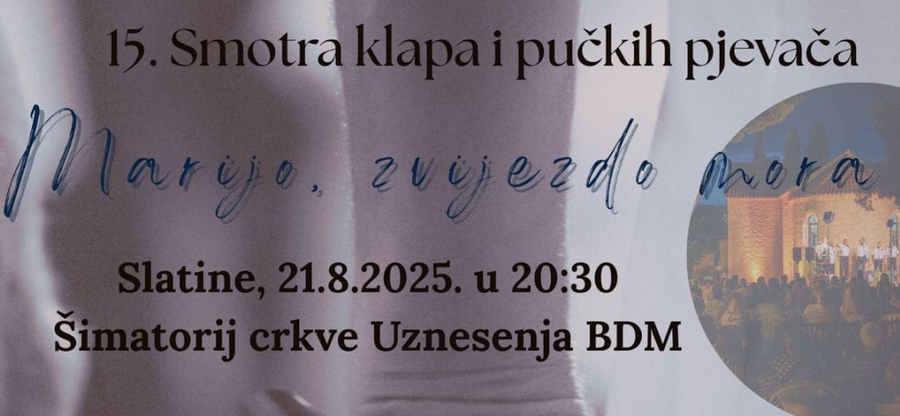 15. Smotra klapa i pučkih pjevača “Marijo, zvijezdo mora”, održati će se danas, 21. kolovoza u 20:30h u Slatinama u Šimatoriju crkve Uznesenja BDM.