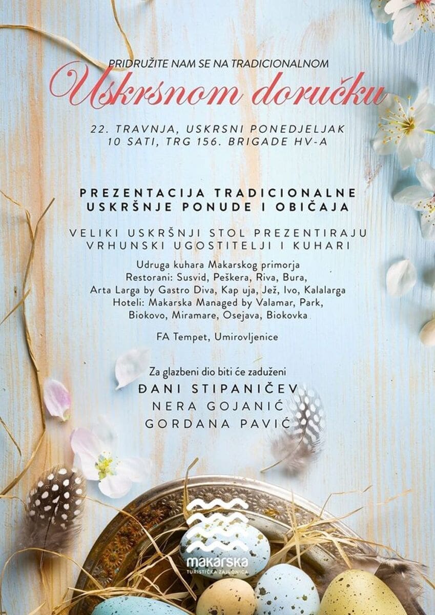 Tradicionalni uskrsni doručak u Makarskoj održat će se 22. travnja, na Uskrsni ponedjeljak. Početak je u 10 sati, Trg 156. brigade HV-a.