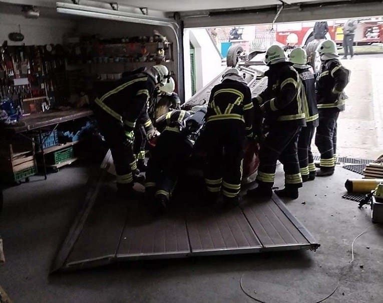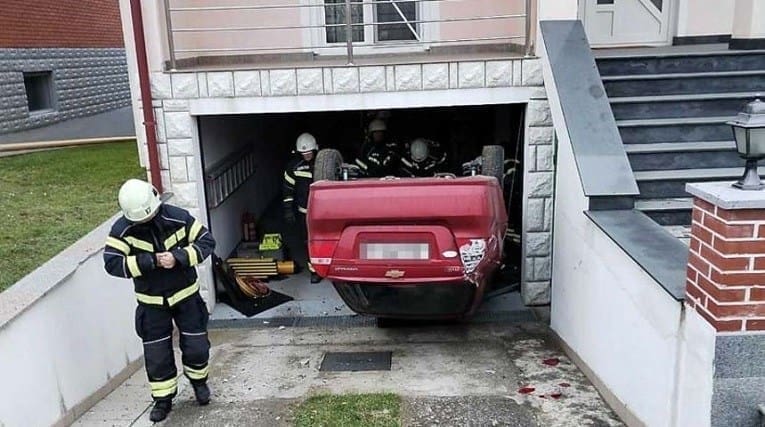 Vozač automobila je izgubio kontrolu nad vozilom i sletio je s ceste na travnatu potvršinu. Potom je uletio u garažu obiteljske kuće gdje je srušio garažna vrata i autom završio na krovu, piše SiB.